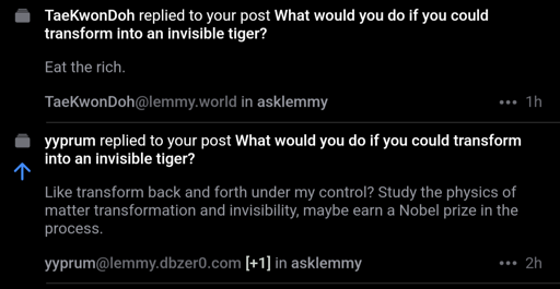 minus-squareZerush@lemmy.mllinkfedilinkEnglisharrow-up0·4 months agoThe first question, what would you as a blind Tiger do? The price of invisibility, you can’t project an image on a invisible retina.